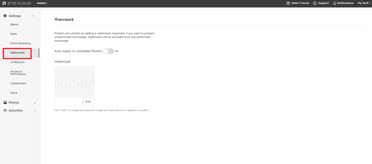 To apply a Watermark, toggle the Watermark feature to on. Then click Edit.