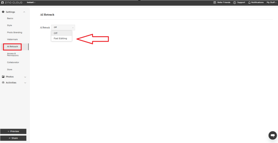 We have linked Zno Retoucher to our Instant Galleries so your clients can see your images at their edited best. To link Zno Retoucher to your Instant Gallery, toggle AI Retouch to Fast Editing.