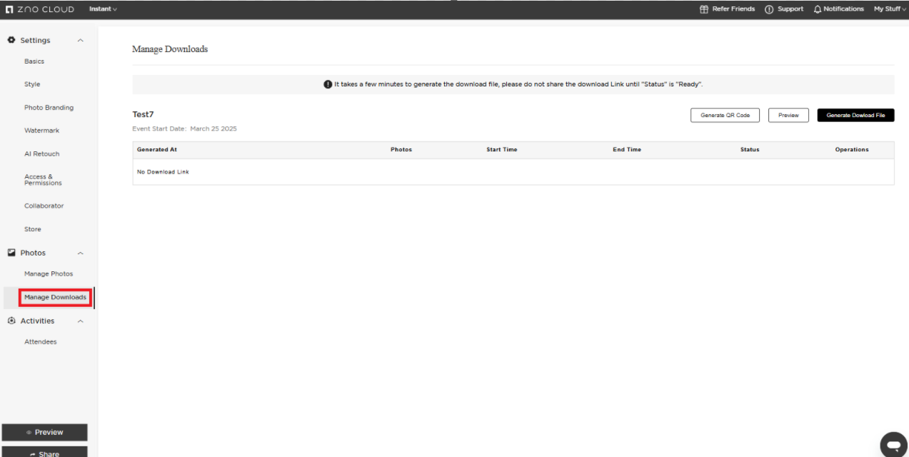 The Manage Download feature allows you to generate a download link to download a zip file of all photos in this Zno Instant Gallery.