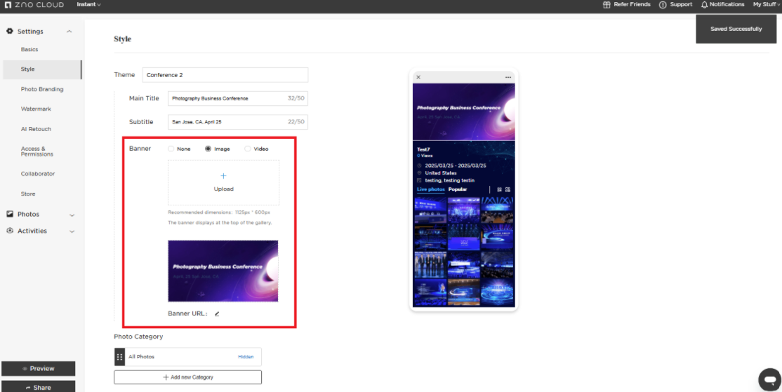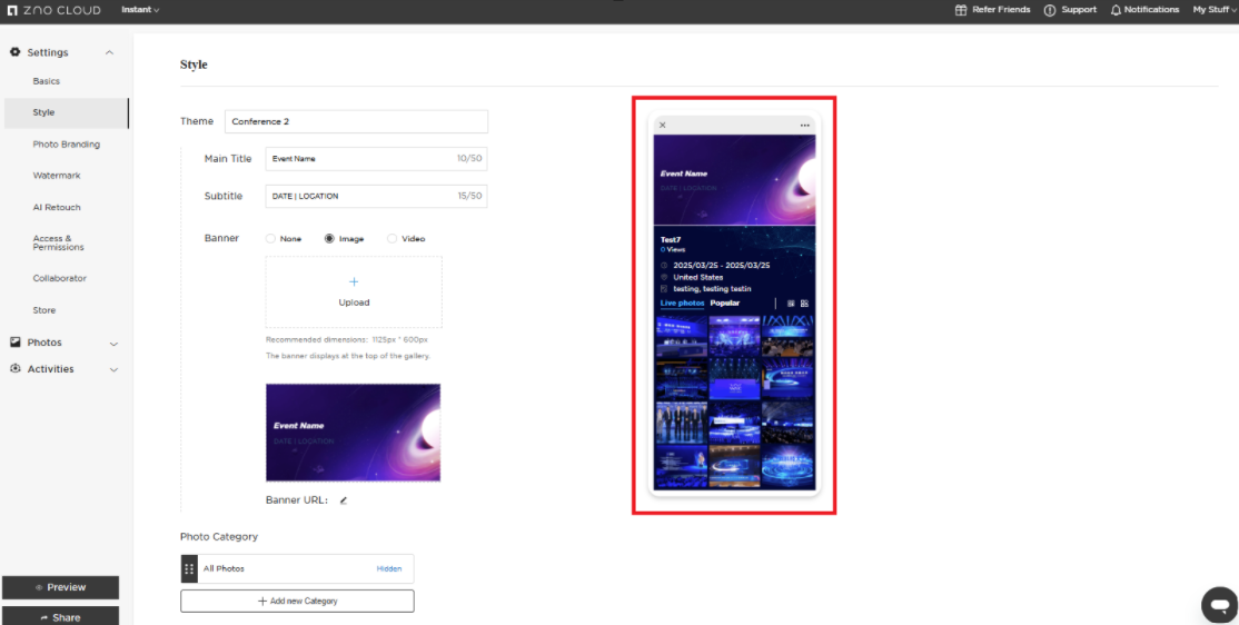 When you click on Theme, you can select one of our preset templates to showcase your Instant Gallery or you can upload your own custom design.