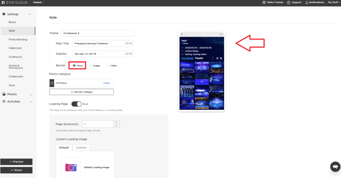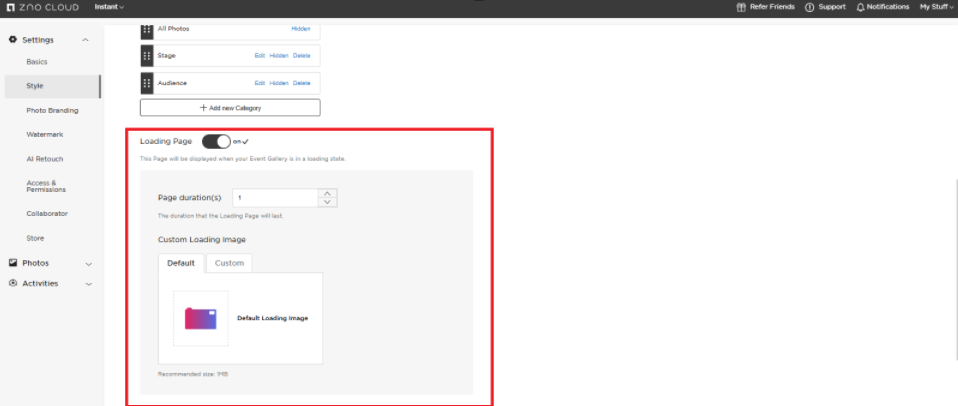 Under the Loading Page, you can customize the image and the duration of how long that image shows up while the Instant Gallery is loading.