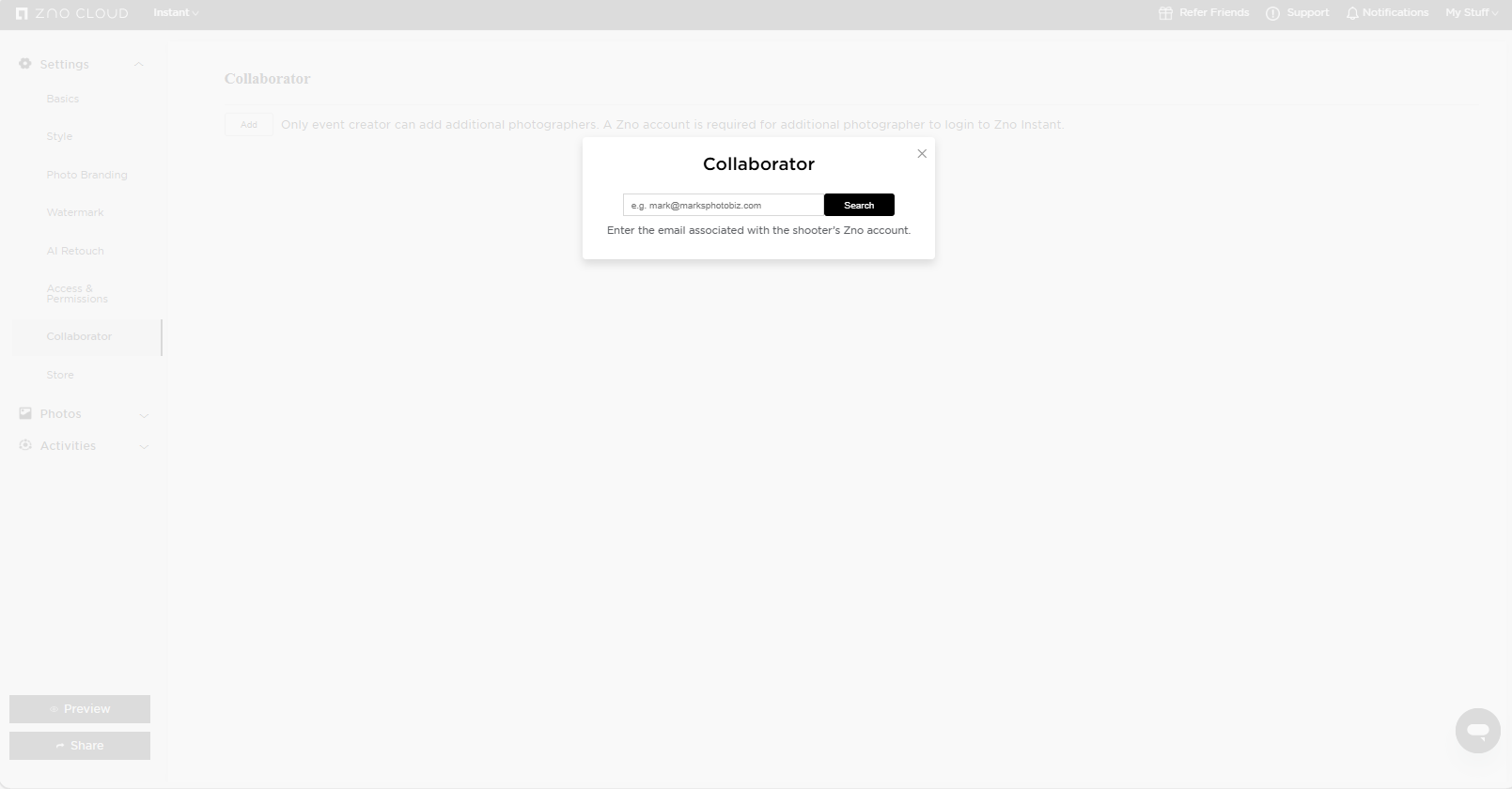 Una vez que hagas clic en Agregar - Add, se te pedirá ingresar el correo electrónico del fotógrafo y hacer clic en Buscar - Search.