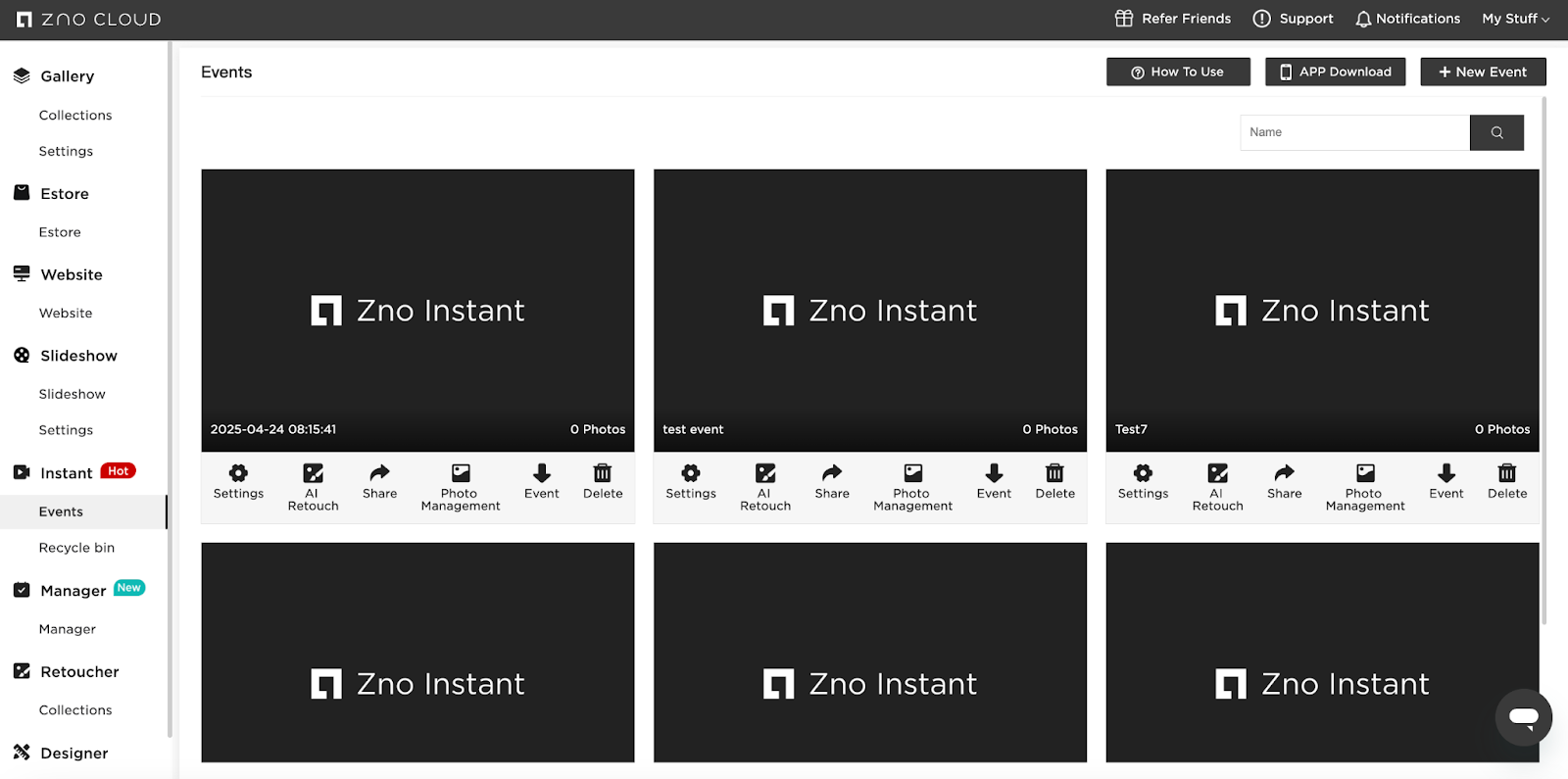 En el espacio de trabajo, ve a la página general de ZNO Instant. Allí verás todas tus Galerías Instantáneas de ZNO.