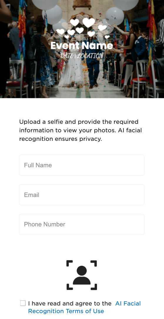 Los invitados pueden tomarse una foto para acceder instantáneamente a una galería privada con únicamente sus fotos, utilizando reconocimiento facial impulsado por IA.