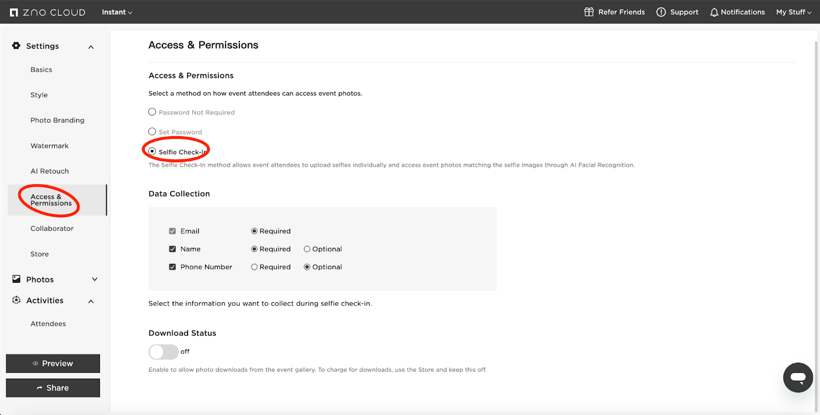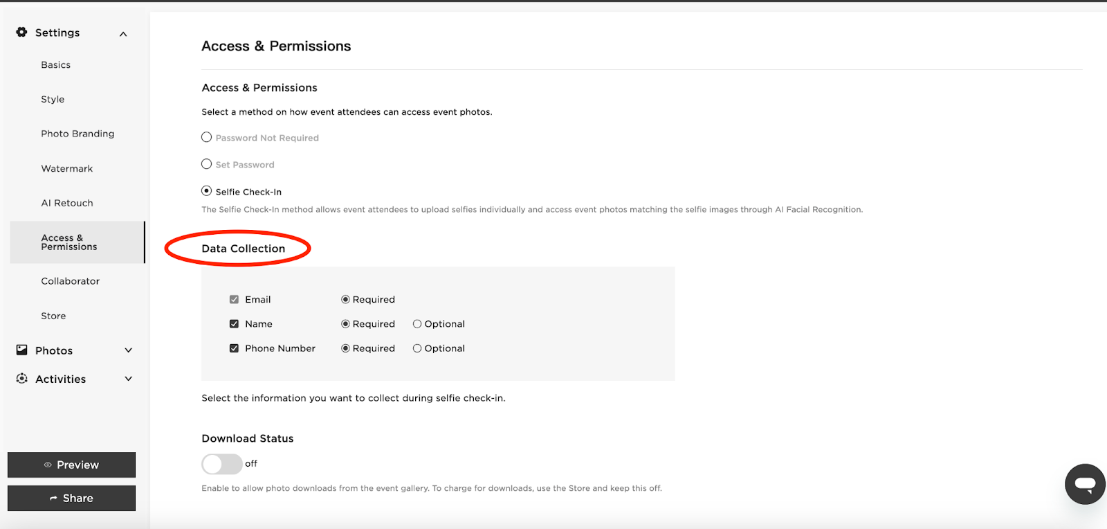 Mientras estás en esta pantalla, verás una sección donde puedes seleccionar qué datos recopilarás junto con la selfie. El correo electrónico es obligatorio, pero puedes configurar el número de teléfono y el nombre del invitado como requeridos u opcionales en el formulario que deberán completar al enviar su selfie.
