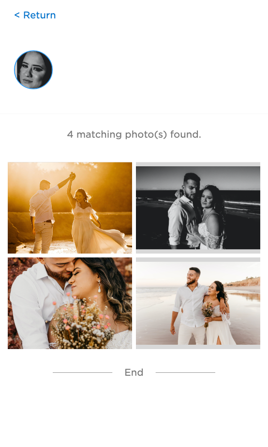 La Inteligencia Artificial localizará todas las imágenes del evento en las que aparezca esta persona, basándose en la selfie que haya subido, y podrá verlas en la Galería Instantánea. Los clientes solo podrán ver una galería privada que contiene únicamente sus propias fotos.