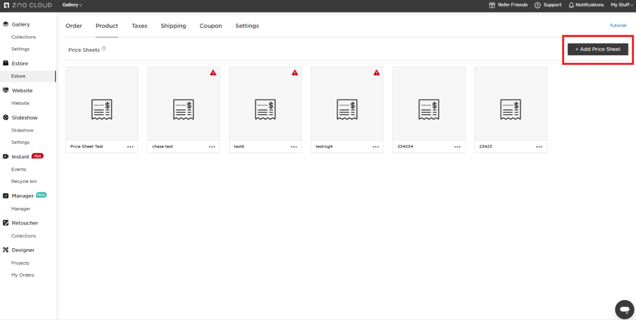 En esta pantalla verás todas tus Galerías Instantáneas de ZNO. Haz clic en el botón Configuración de la galería que deseas convertir en un carrito de compras.