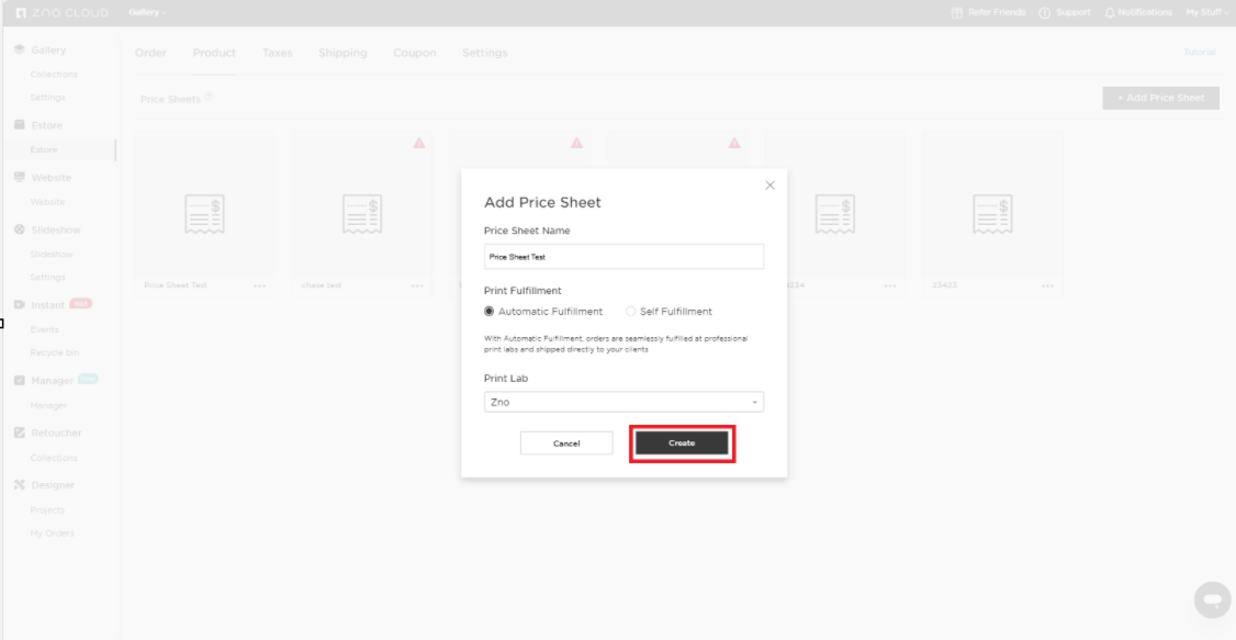 Una vez que actives el Estado de la Tienda en ON, se te pedirá que adjuntes una Hoja de Precios a tu Galería Instantánea. Si aún no has configurado una Hoja de Precios, haz clic en la palabra “aquí” para crearla.