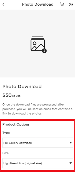 Una vez ingresen su correo electrónico, verán los tipos de productos disponibles para compra en esta Galería Instantánea. Las siguientes instrucciones corresponden a la compra de una descarga digital, pero el proceso es similar para todos los productos.