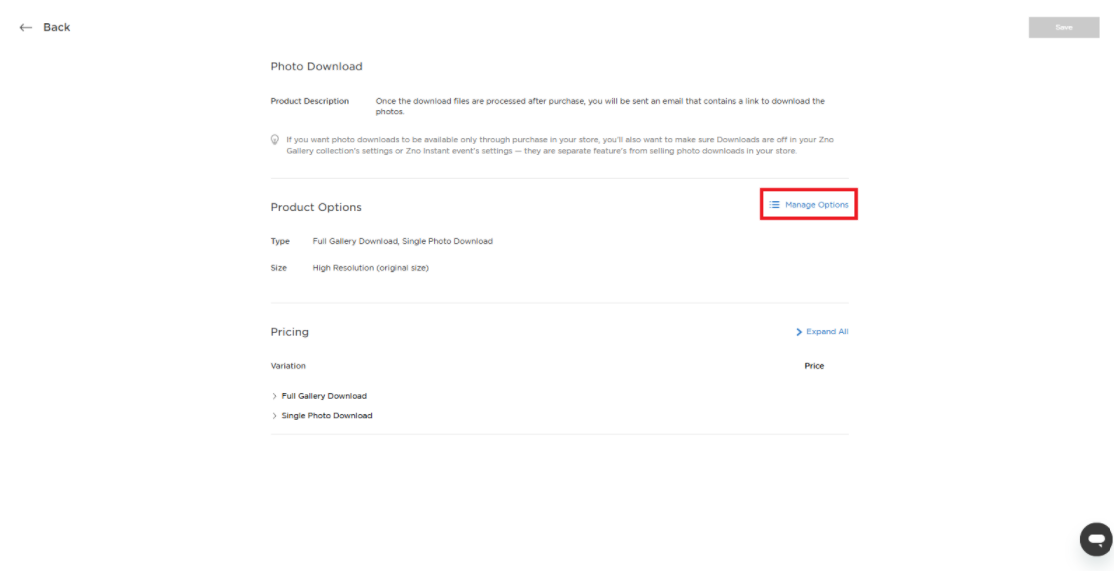Luego, haz clic en Administrar Producto dentro de las Opciones de Producto para seleccionar las opciones que deseas que estén disponibles para tus clientes.