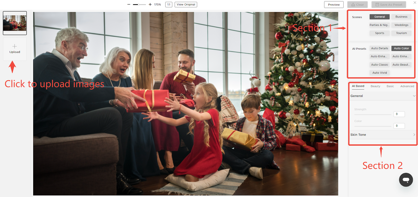 En el espacio de trabajo de la derecha, la Sección 1 corresponde a las opciones de configuración rápida de la pantalla anterior. Después de subir tus fotos y seleccionar los ajustes deseados, haz clic en Vista previa para ver el resultado retocado por IA.