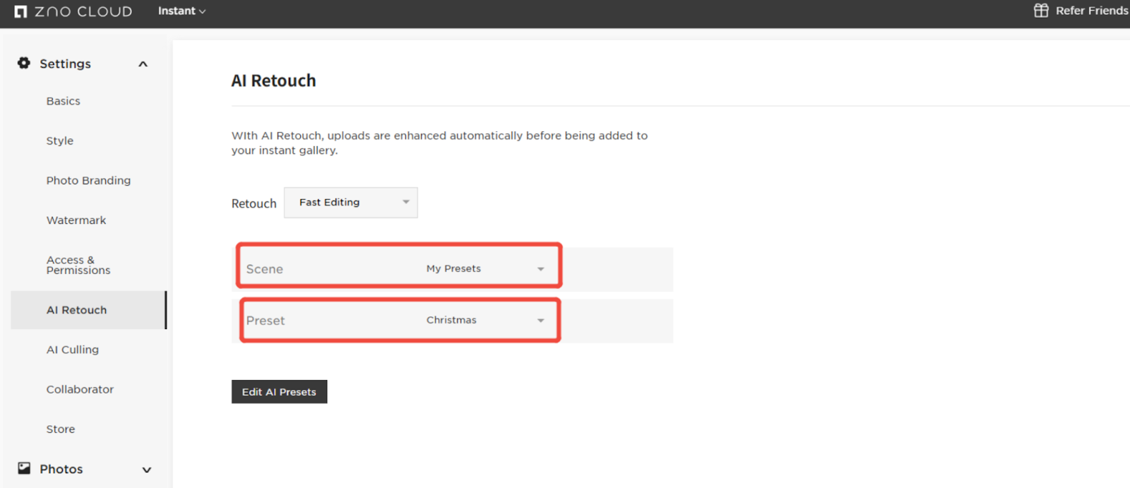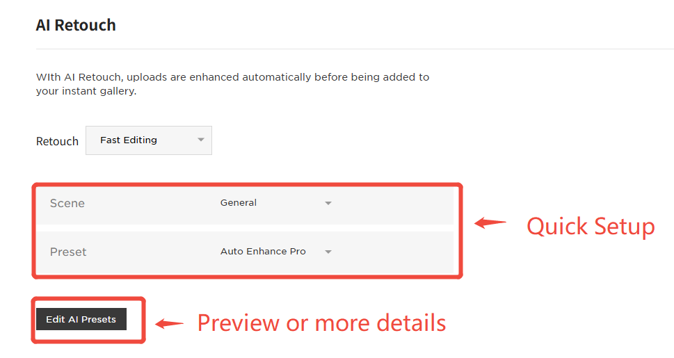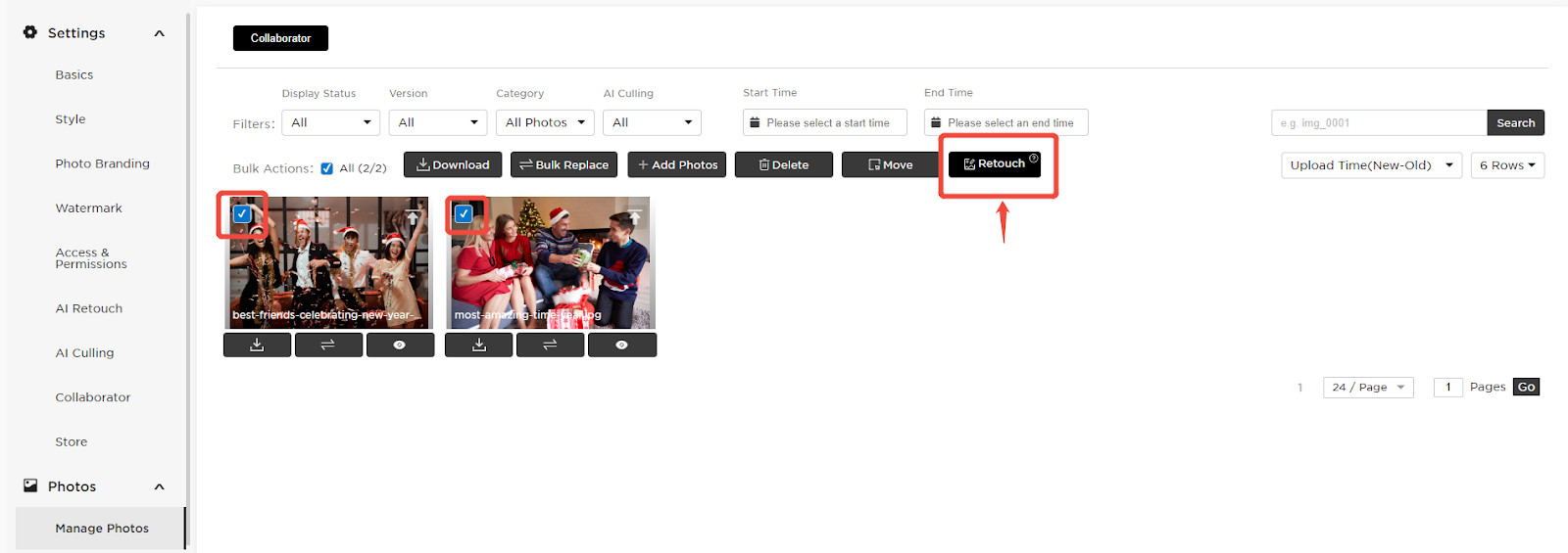 Nota: Una vez que hayas completado la configuración del retoque con IA, esta solo afectará a las fotos subidas después de haberla configurado. Para aplicar el retoque con IA a fotos existentes, selecciona las fotos que desees editar y haz clic en Retocar.