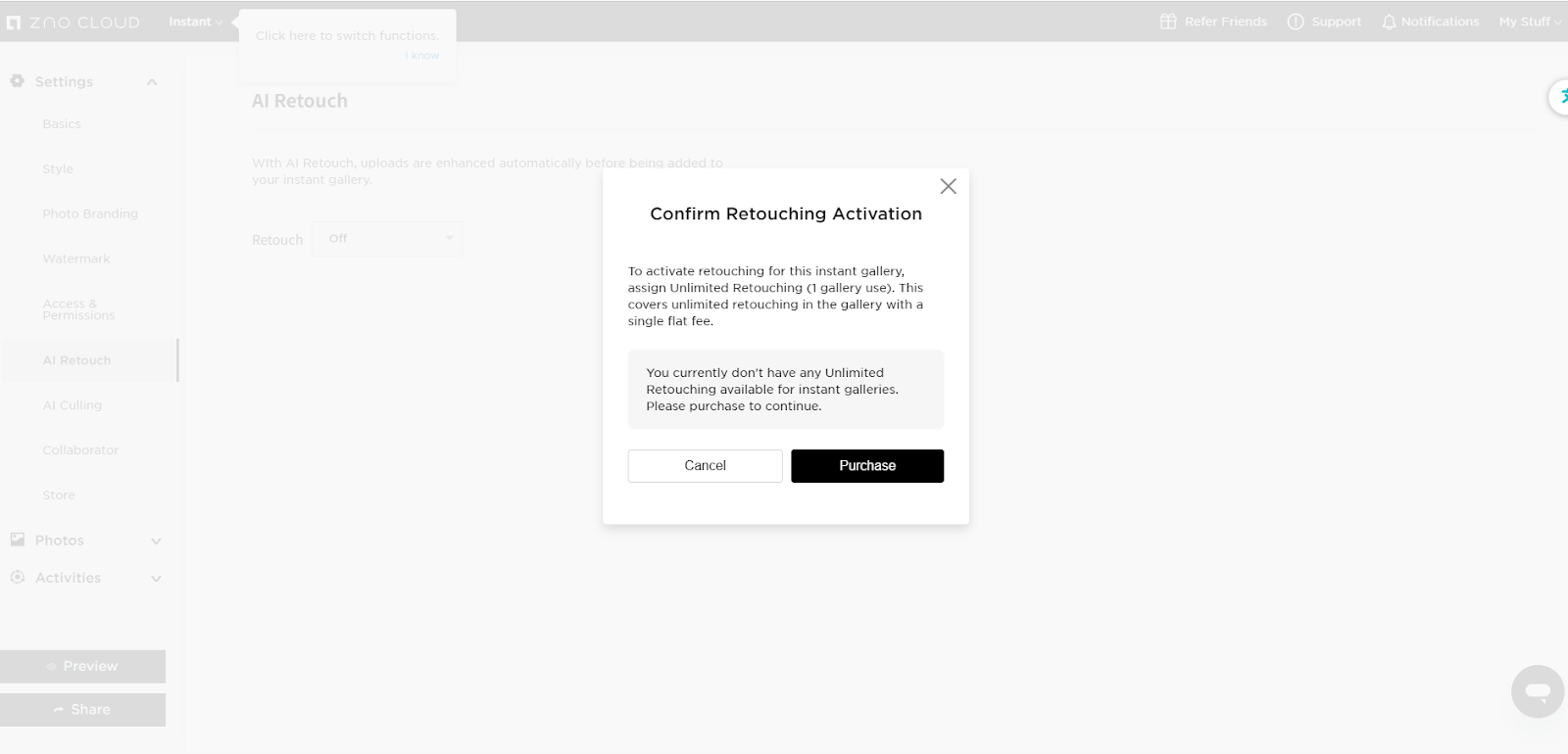 El Retoque con IA actualmente se cobra por sesión. Al seleccionar Edición Rápida, si aún no has adquirido el servicio de retoque de ZNO, aparecerá una ventana emergente.