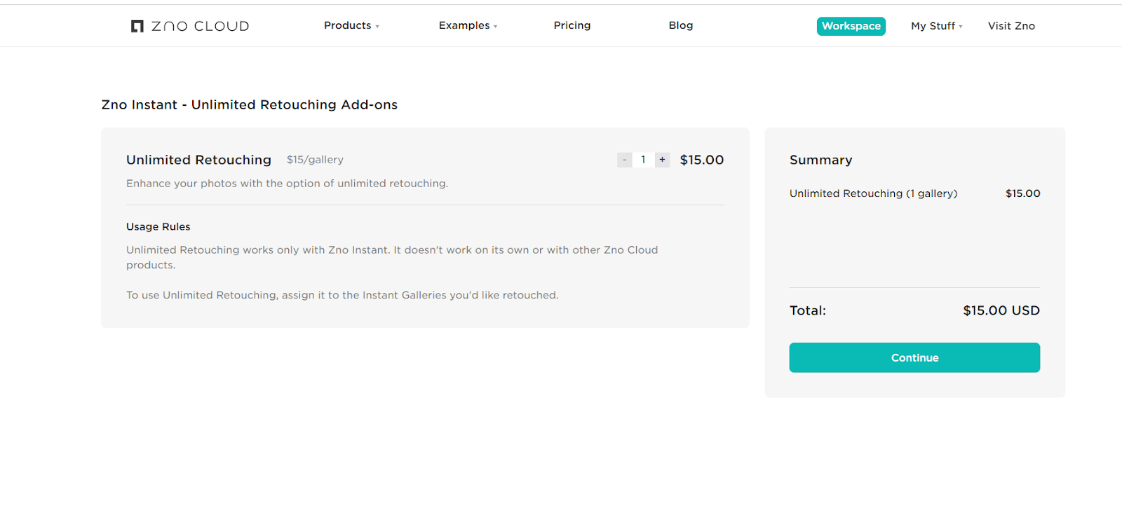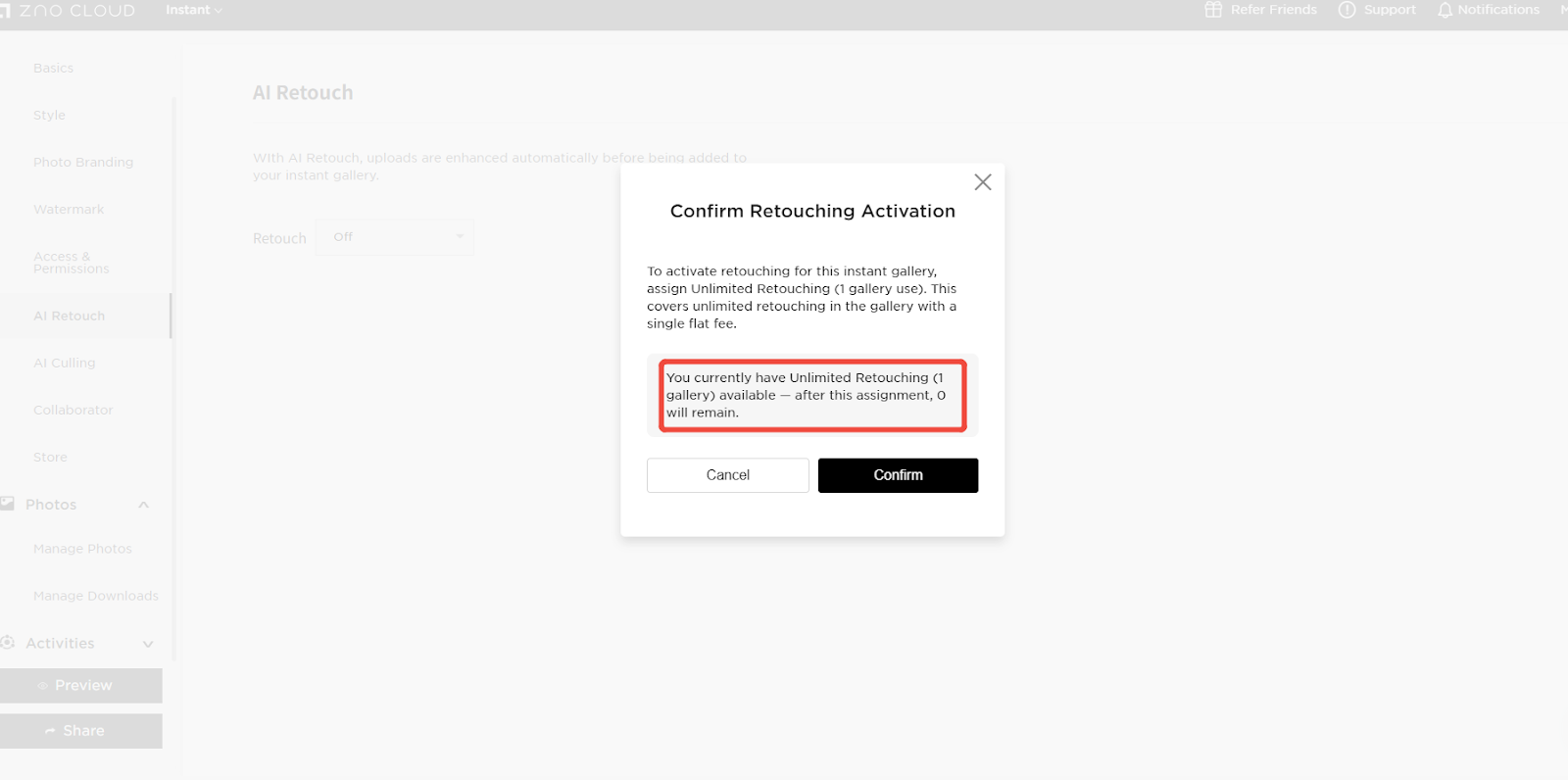 Una vez que hayas completado la compra de ZNO Retouching —o si ya lo has comprado anteriormente—, al seleccionar Edición rápida aparecerá la siguiente ventana emergente. El recuadro rojo muestra el número de sesiones de retoque restantes que tienes actualmente, así como las sesiones restantes tras el uso.