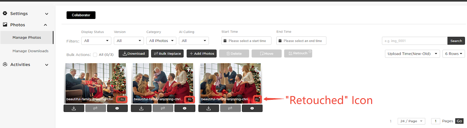Una vez que hayas completado los ajustes anteriores, todas las fotos subidas a Instant Gallery a partir de ese momento aparecerán marcadas con un pequeño icono de Retocado. Este icono solo aparecerá en tu espacio de trabajo con fines de gestión y no será visible para tus clientes.