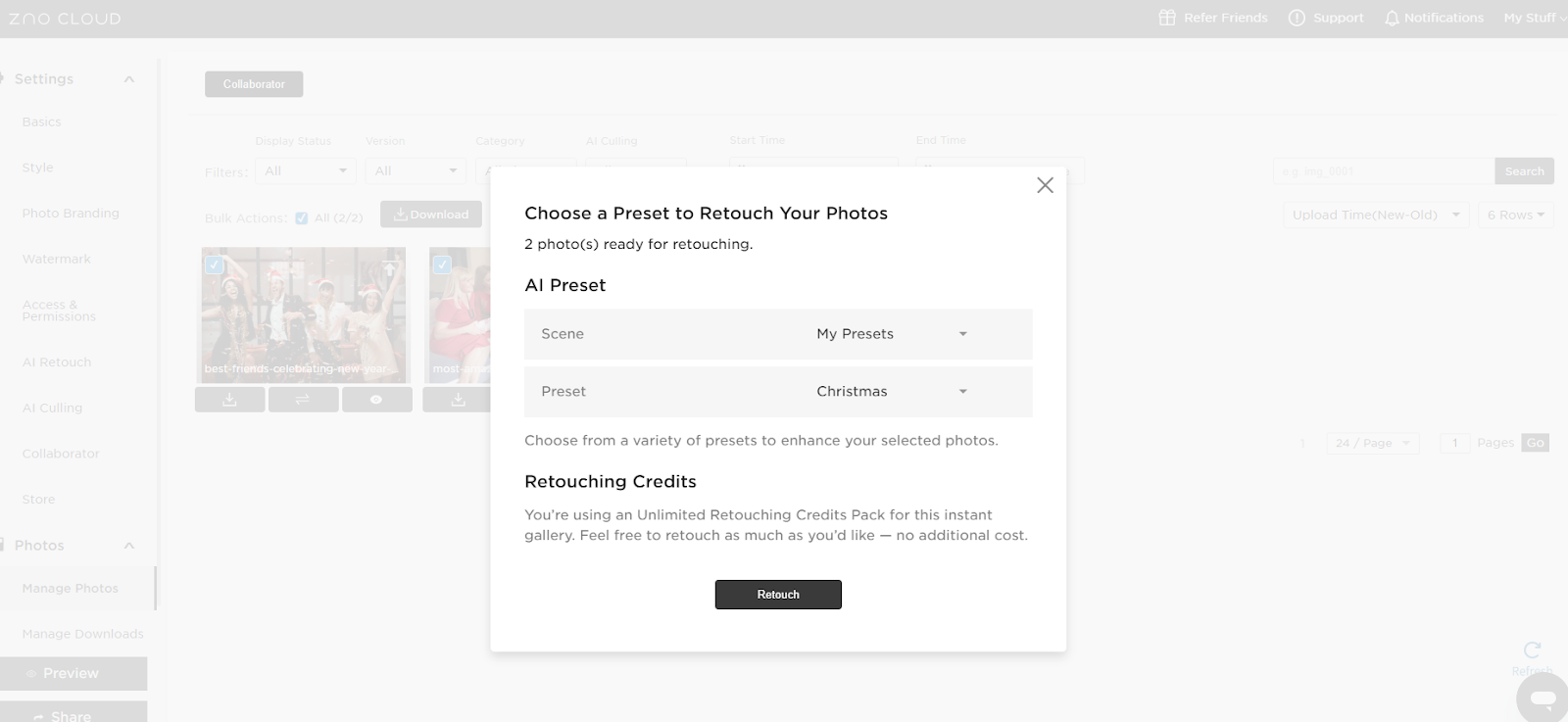 En la interfaz emergente, verás las mismas opciones de configuración que se describen en el flujo de trabajo anterior. Simplemente elige los ajustes que desees para aplicar el retoque con IA a las fotos existentes que aún no hayan sido retocadas.