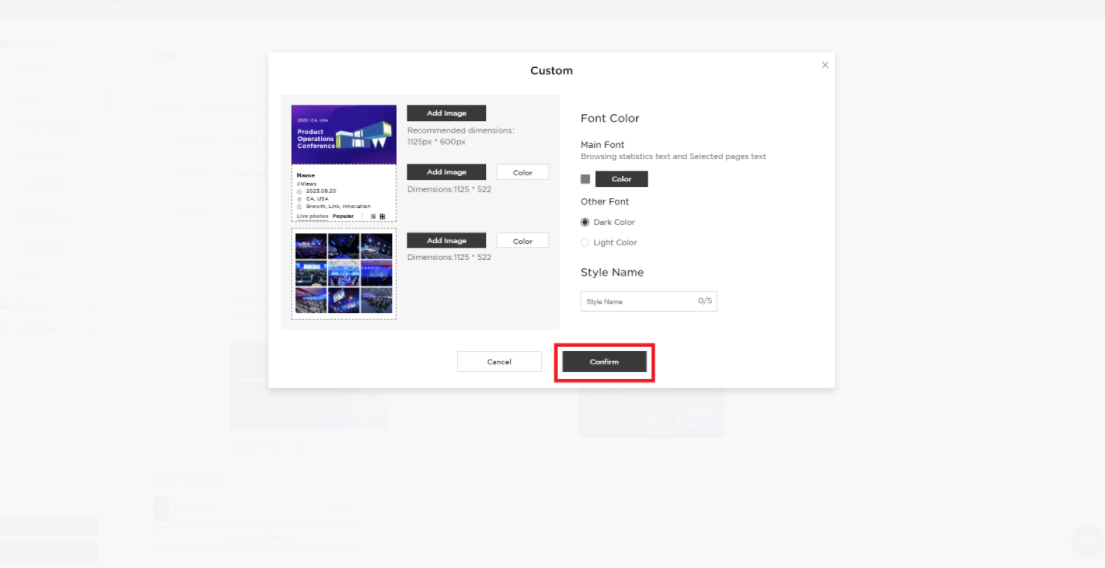 En esa ventana podrás subir imágenes para personalizar el diseño, elegir el color y el tipo de fuente. También puedes asignarle un nombre para reutilizarlo en el futuro; al hacerlo, este estilo aparecerá en la sección Custom.