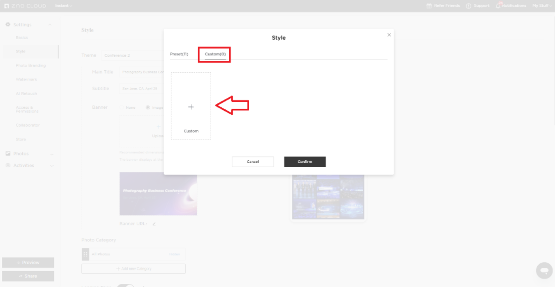 Para subir tu propio preset personalizado, haz clic en la pestaña Custom en la parte superior y, en la ventana emergente, selecciona Custom - Personalizado.