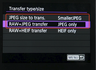 Luego selecciona "Tipo/tamaño de transferencia" y selecciona "Tamaño JPEG para transferir" para elegir el tamaño de imagen que deseas subir. Para "Transferencia RAW+JPEG", selecciona "Solo JPEG".