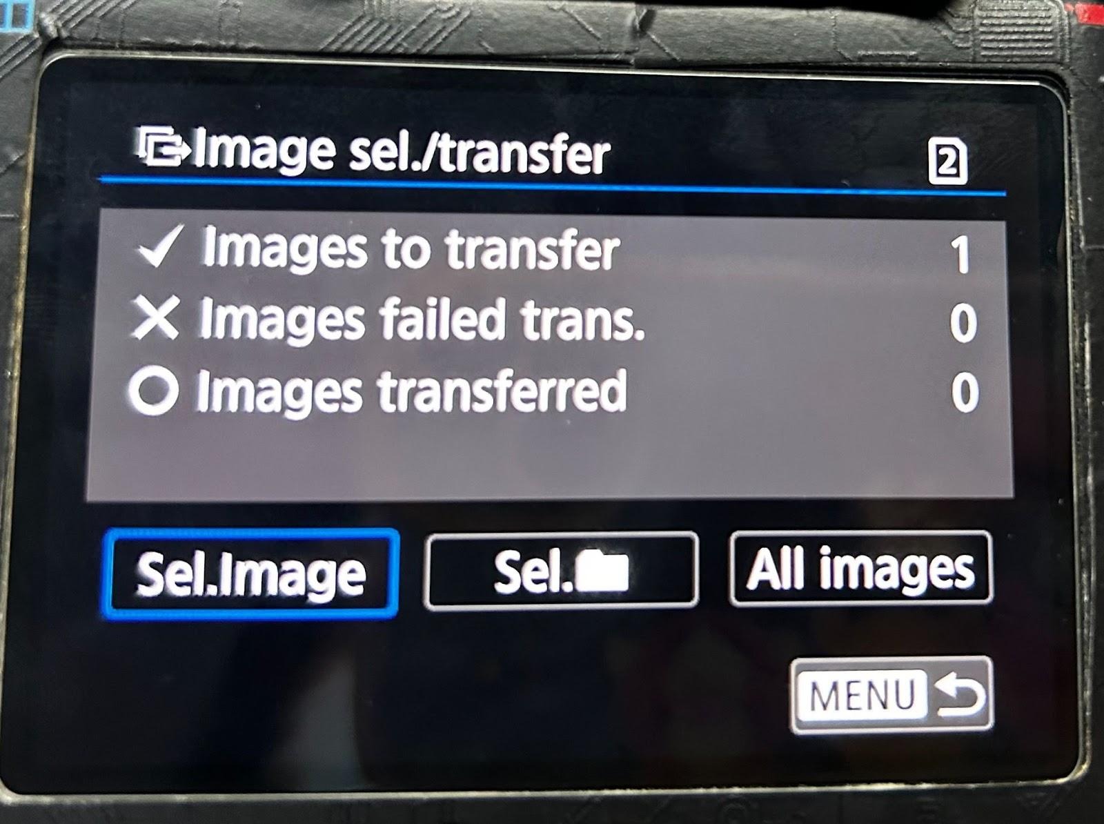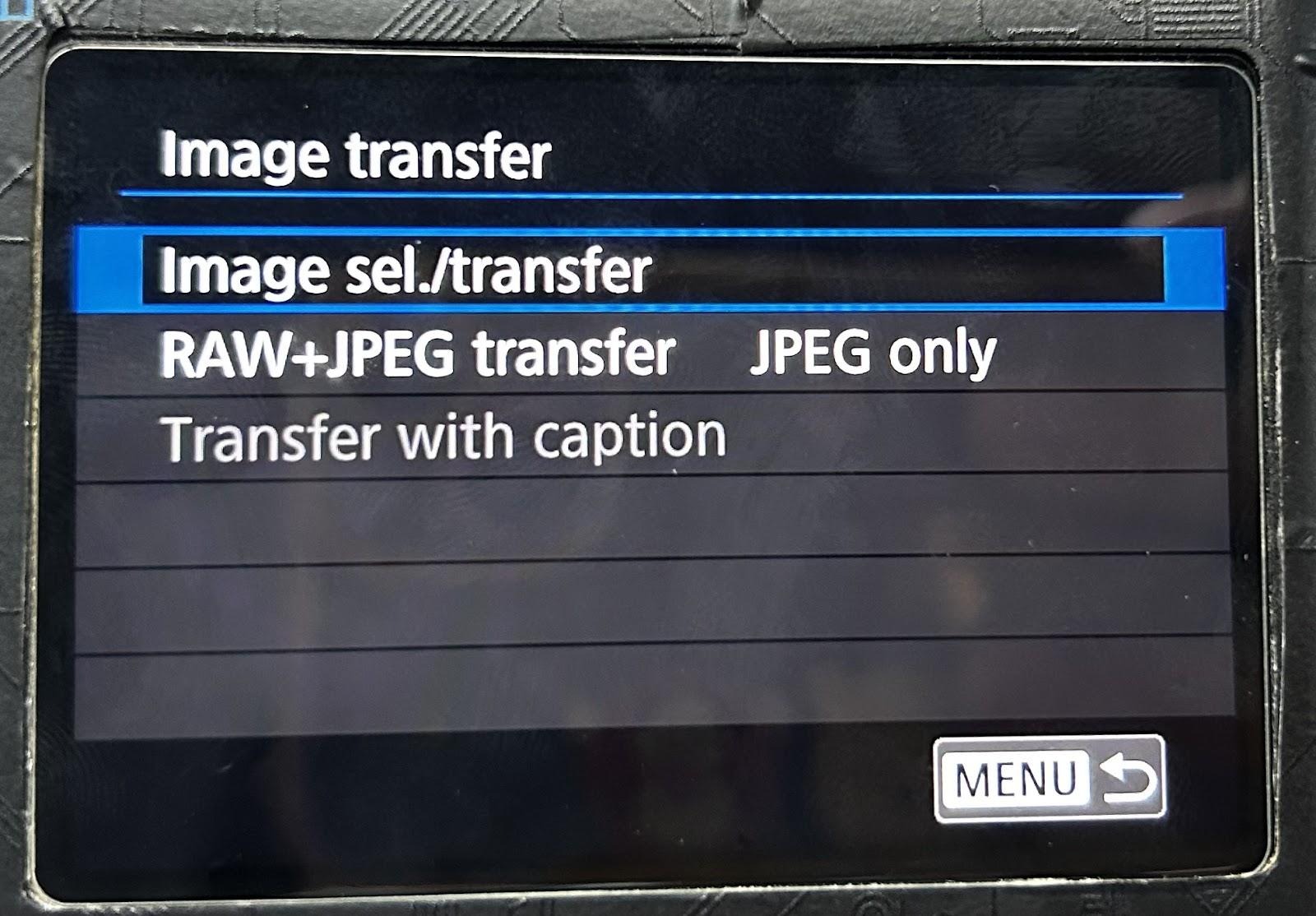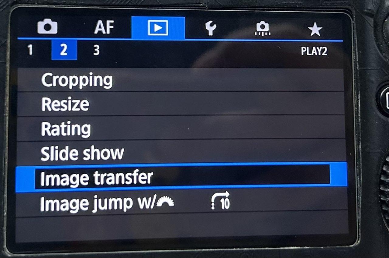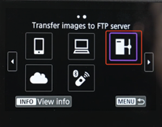Canon 5D4 como referencia, puedes encontrar Transferencia de imagen en la barra de reproducción - haz clic en “Transferencia de imagen” > “Selección/transferencia de imagen". Y haz clic en “Transferencia FTP” para subir imágenes.