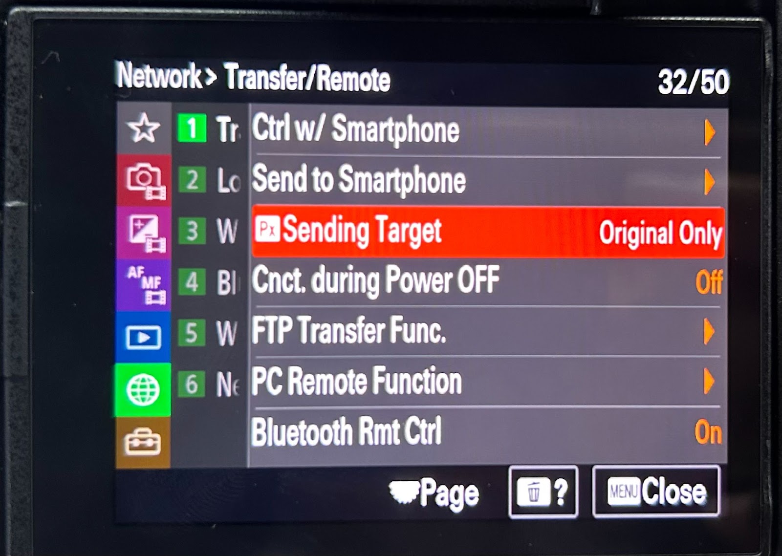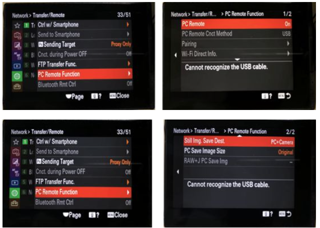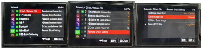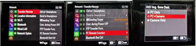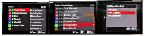 Para usar este modo, ajusta la opción “Conexión USB” de la cámara a “PC Remote”. Una vez dentro de “Configuración de PC Remote”, cambia “Destino de guardado de imágenes fijas” a “Computer + Capture Device”o “Phone + Capture Device”. Luego, cambia “Tamaño de imagen guardada en el computador” a “Original”.