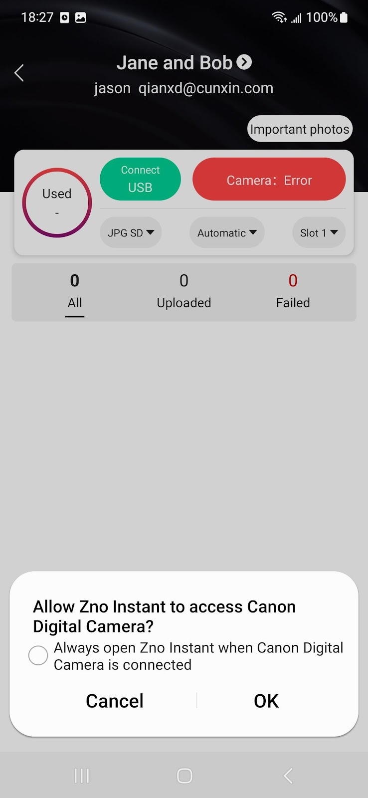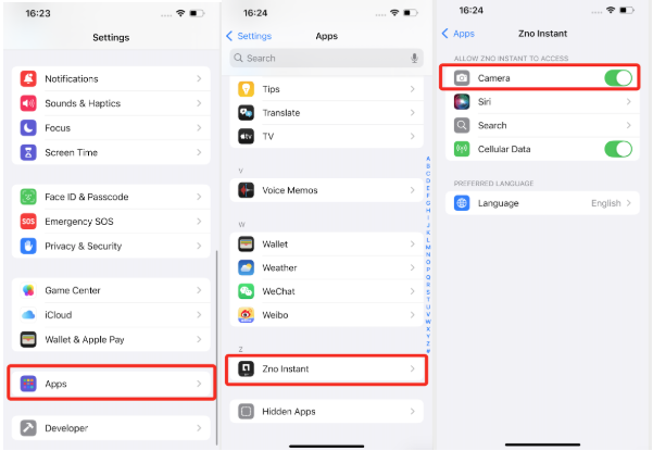 - Verifica si tu sistema telefónico ha otorgado el permiso de acceso a la cámara para ZNO Instant.