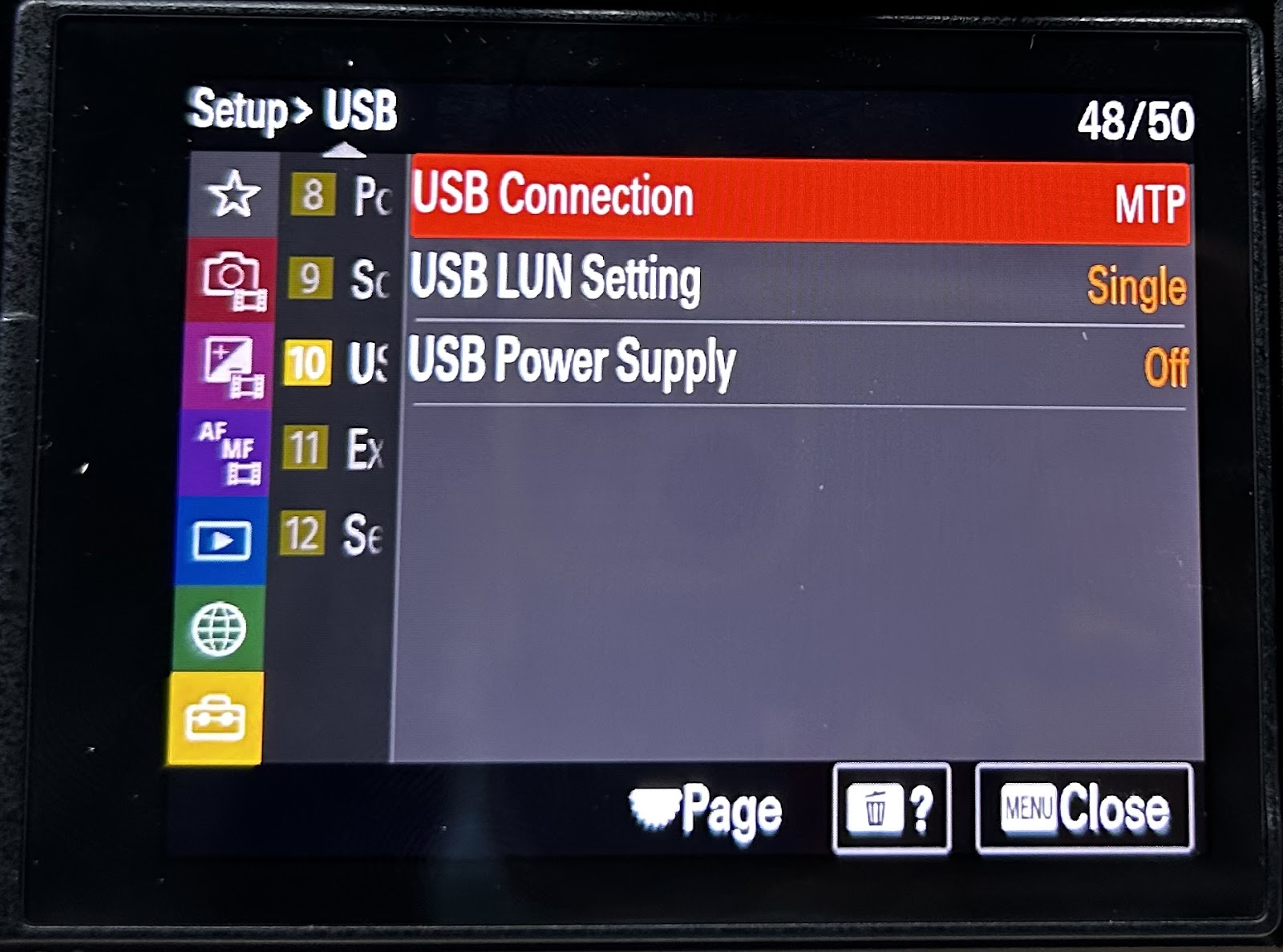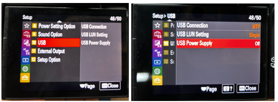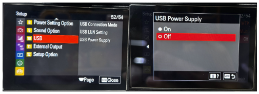 - Desactiva la opción de alimentación por USB en la cámara: “Configuración” > “USB” > “Suministro de energía por USB” – Desactivado.