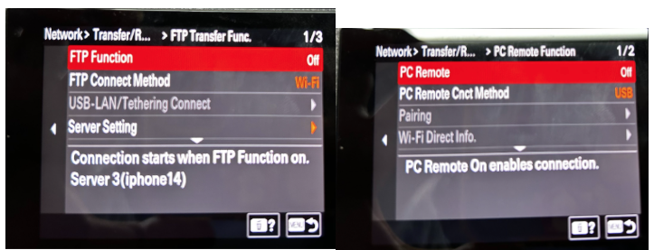 - Configurar: “Red” > “Transferencia / Remoto” > desactiva la “Función FTP” y desactiva “PC Remote”.