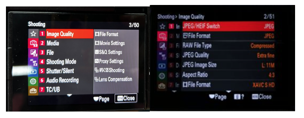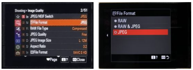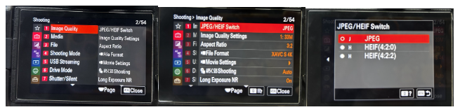 Selecciona “Disparo” > “Calidad de Imagen” > “Cambio JPEG/HEIF” > “JPEG”.