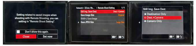 Si haces clic en “Cerrar”, puedes encontrar “Red” > “Captura/Remoto” > “Disparo Remoto” > “Destino de guardado de imágenes fijas” > “Destino + Cámara”.