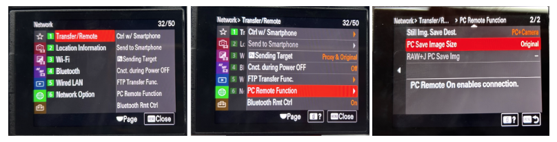 Paso 1: Configura “Red” > “Transferencia/Remoto” > “Función PC Remote” - “Tamaño de imagen guardada en PC” a “Original”.