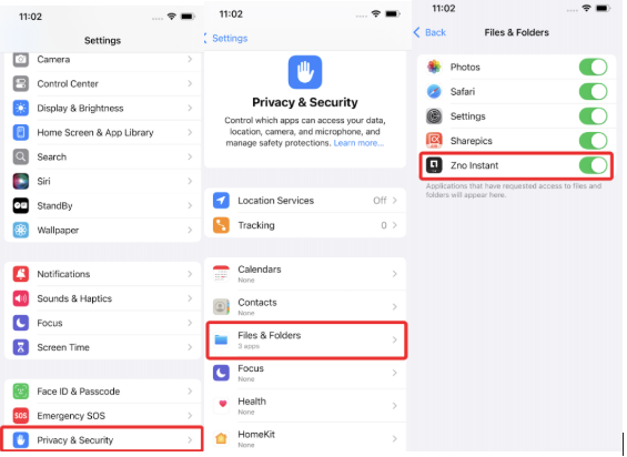 Ve a Configuración > Privacidad > Archivos y Carpetas, selecciona ZNO Instant y activa los permisos (debe quedar en color verde).