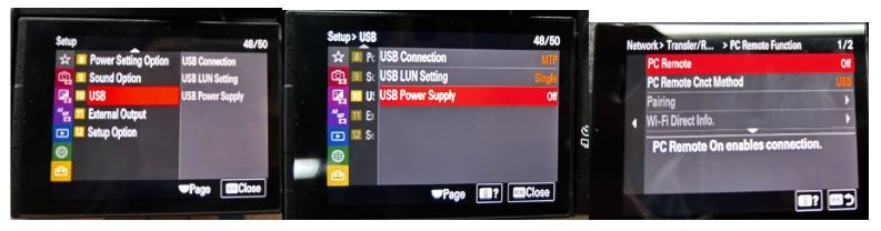 Revisa la configuración de la cámara, asegúrate de que la opción de suministro de energía por USB esté desactivada y configura el modo de conexión USB a PC Remote.