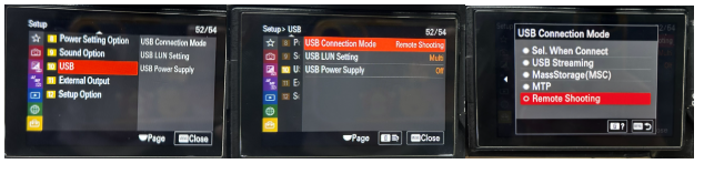 (3) Selecciona “USB” > “Modo de Conexión USB” > “Disparo Remoto”.